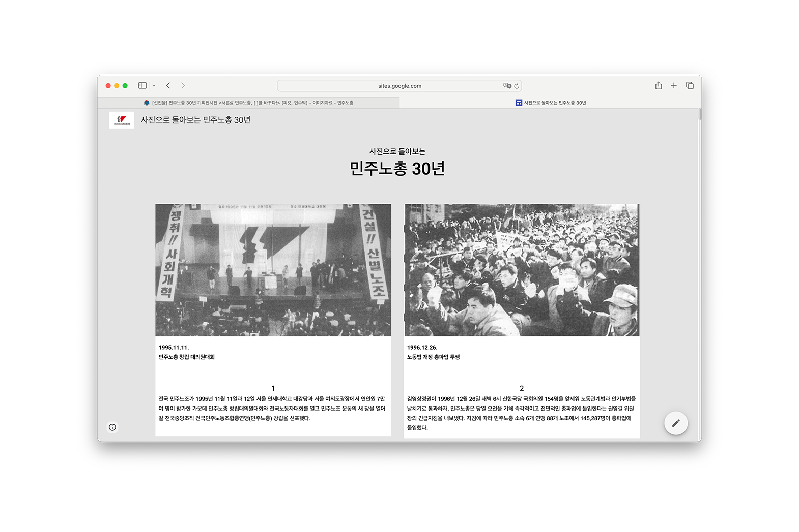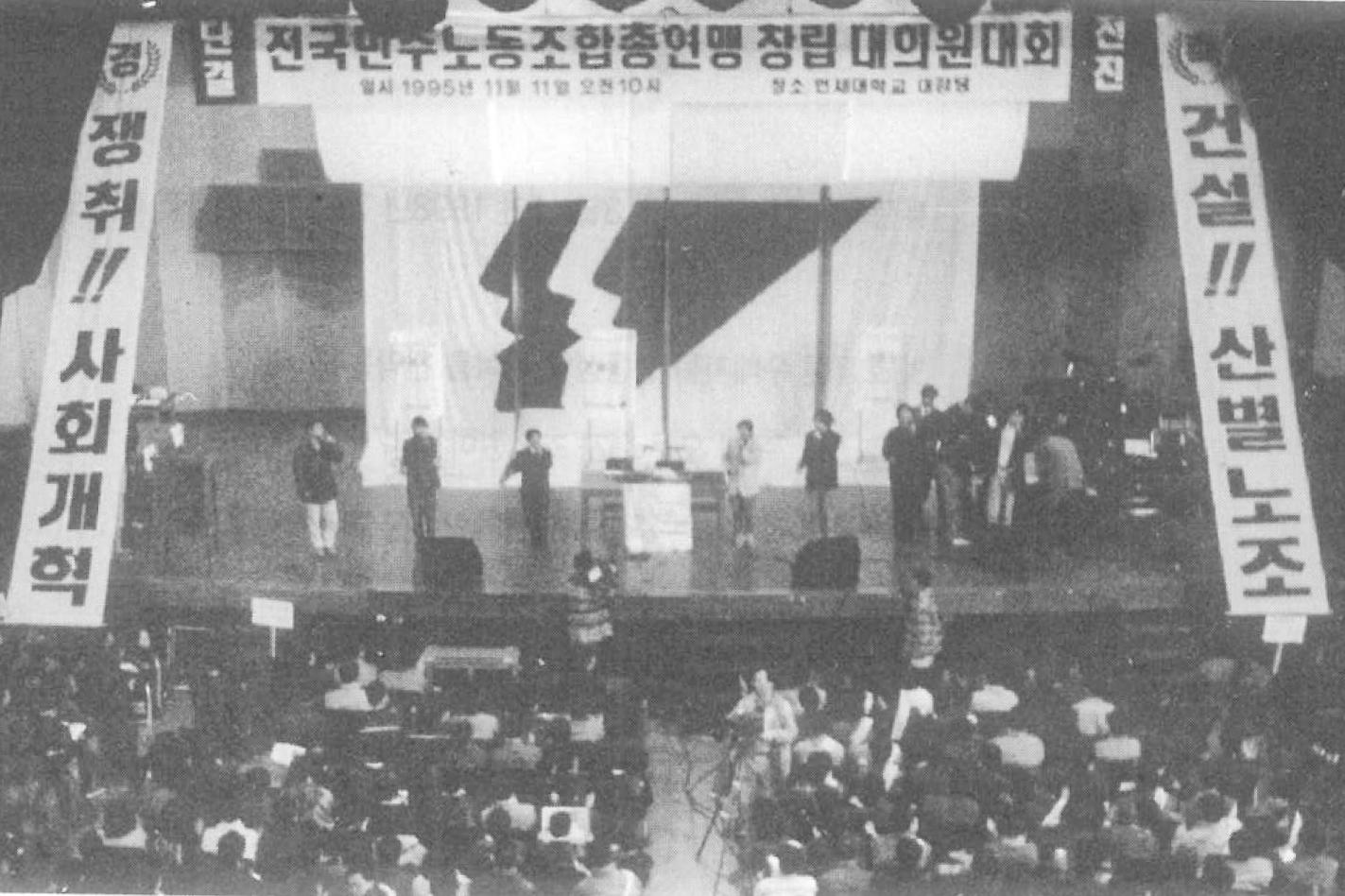 사진으로 보는 민주노총 30년 이 사이트 검색 삽입된 파일 메인 콘텐츠로 건너뛰기 탐색으로 건너뛰기 사진으로 돌아보는 민주노총 30년 사진으로 돌아보는 민주노총 30년 1995 . 11 . 11 . 민주노총 창립 대의원대회 1 전국 민주노조가 1995년 11월 11일과 12일 서울 연세대학교 대강당과 서울 여의도광장에서 연인원 7만여 명이 참가한 가운데 민주노총 창립대의원대회와 전국노동자대회를 열고 민주노조 운동의 새 장을 열어갈 전국중앙조직 전국민주노동조합총연맹(민주노총) 창립을 선포했다. 1996 . 12 . 26 . 노동법 개정 총파업 투쟁 2 김영상정권이 1996년 12월 26일 새벽 6시 신한국당 국회의원 154명을 앞세워 노동관계법과 안기부법을 날치기로 통과하자, 민주노총은 당일 오전을 기해 즉각적이고 전면적인 총파업에 돌입한다는 권영길 위원장의 긴급지침을 내보냈다. 지침에 따라 민주노총 소속 6개 연맹 88개 노조에서 145,287명이 총파업에 돌입했다. 1997 . 03 . 24 . 삼미특수강노조 상경투쟁 3 1996년 12월 16일 삼미특수강은 회사 분할매각 발표에 이어 포항제철이 삼미특수강을 인수하며 위장된 자산매매 방식을 빌어 587명을 해고했다. 해고를 인정할 수 없다는 노동자 182명이 3년에 걸쳐 상경투쟁을 하며 복직투쟁을 벌였다. 삼미특수강의 상경투쟁은 그 자체가 정부 구조조정의 발가벗은 자화상이었다. 1997 . 11 . 26 . 국민승리21 권영길 후보 첫 정당연설회 4 진보정당을 표방한 국민승리21이 1997년 10월 26일 창립대회를 열고 공식 출범했다. 국민승리21 대통령 선거 후보인 권영길 후보는 11월 26일 창원 실내체육관에서 첫 정당연설회를 열고 “정리해고를 막고 금융실명제를 지키기위해 권영길에게 투표해달라”라고 지지를 호소했다. 1998 . 02 . 09 . 민주노총 임시대의원대회 - 제1기 노사정 합의와 부결 사태 5 민주노총은 1998년 2월 9일 서울 성균관대학교 유림회관에서 8차 대의원대회를 열고 앞선 6일 잠정합의된 노사정위원회의 협약한 승인을 거부했다. 배석범 위원장 직무대행을 비롯한 임원들은 책임을 지고 사퇴했다. 민주노총은 단병호 비상대책위원장(금속연맹 위원장) 체제로 전환했다. 1998 . 07 . 12 . 양대노총 전국노동자대회 6 민주노총이 1998년 7월 12일 한국노총과 함께 10만 조합원이 모인 가운데 서울 여의도 둔치에서 전국노동자대회를 열고 ‘고용안정, 생존권 사수’를 내세우며 “작은 차이를 극복하고 양대노총 조합원이 하나로 단결해 쓰러져가는 경제를 살리고 노동자 민중의 생존권을 지켜내자”라고 한목소리로 외쳤다. 1998 . 07 . 14 . 현대자동차노조 무기한 전면 파업 7 회사가 정리해고 신고서를 접수하자 현대자동차노조는 1998년 6월 30일 26시간 파업, 7월 6일 48시간 파업에 돌입하며 ‘정리해고 철회와 주35시간으로 근로시간 단축, 근무형태변경을 통한 고용유지’를 촉구했다. 요구가 받아들여지지 않자 14일 무기한 전면총파업에 돌입했다. 1999 . 04 . 19 . 서울지하철노조 총파업 돌입 8 서울지하철노조 조합원 6천5백여 명은 1999년 4월 18일 저녁부터 이어진 경찰의 봉쇄를 뚫고 자정무렵 세종대와 신정기지, 명동성당에 집결했다. 19일 새벽 서울지하철노조 지도부는 명동성당에서 “지금부터 파업이다”라며 파업을 선언했고, 조합원들은 지침을 받아 산개투쟁에 돌입했다. 1999 . 06 . 08 . 검찰 조폐공사 파업유도 관련 진상규명 요구 9 1998년 10월 조폐공사가 옥천 조폐창을 폐쇄하고 경산으로 통폐합한다는 일방적인 계획을 발표한 두달 뒤 폐쇄, 조업중단을 강행하자 노조는 파업에 돌입했다. 6개월 뒤 이 사건이 진형구 당시 대검찰청 공안부장의 공작임이 드러나 민주노총이 진상규명을 요구하고 나섰다. 1999.0 7 .0 3 . 전교조 신고필증 획득 10 전국교직원노동조합이 ‘교원의노동조합설립및운영등에관한법률안’이 발효됨에 따라 1999년 7월 1일 오전 9시 노동부에 설립신고서를 제출하고 3일 신고필증을 획득했다. 1989년 노조 결성 3일 뒤인 5월 31일 노동부에 숨어들어가 설립신고서를 제출했다 반려된지 10년 만이다. 1999 . 07 . 13 . 방송노조연합 방송법 개악저지 위한 총파업 11 KBS, MBC, KBS계열사, 방송위원회노조로 구성된 방송노조연합이 199년 7월 13일 새벽 6시를 기해 ‘통합방송법’이 국회통과를 앞두자 방송법 개악저지를 위한 총파업에 들어갔다. 방송사노조들이 연대 총파업에 돌입한 것은 ‘노동법 날치기 총파업’에 돌입한 이래 처음이다. 1999 . 08 . 10 . 1999 통일염원 남북노동자축구대회 12 99통일염원 남북노동자축구대회에 참가하기 위해 평양을 방문한 민주노총 대표단과 축구선수단이 199년 8월 12일 조선직업총동맹과, 13일 남북혼합팀을 구성해 평양 김일성경기장에서 축구경기를 치렀다. 10일 평양에 도착한 대표단과 축구선수단은 14일 판문점을 넘어 서울로 돌아왔다. 2000 . 01 . 30 . 민주노동당 창당대회 13 민주노동당은 2000년 1월 30일 서울 올림픽공원 역도경기장에서 당원 등 3천여 명이 참가한 가운데 창당대회를 열고 공식출범을 선언했다. 민주노동당은 창당선언문에서 “민주노동당은 노동자・농민・빈민・중소상공인의 정당이며 여성・청년・학생・진보적 지식인의 정당”이라고 밝혔