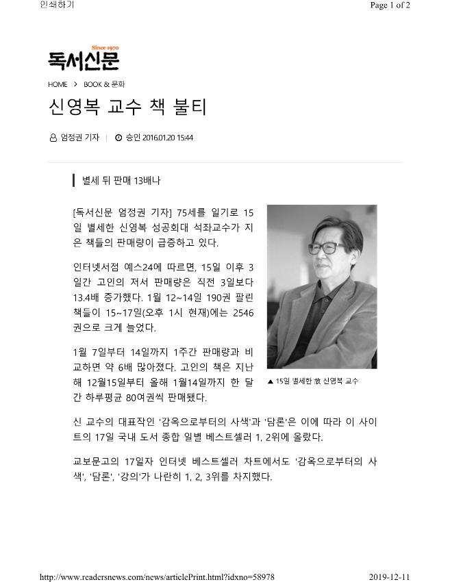 [독서신문 엄정권 기자] 75세를 일기로 15일 별세한 신영복 성공회대 석좌교수가 지은 책들의 판매량이 급증하고 있다. 인터넷서점 예스24에 따르면, 15일 이후 3일간 고인의 저서 판매량은 직전 3일보다 13.4배 증가했다. 1월 12~14일 190권 팔린 책들이 15~17일(오후 1시 현재)에는 2546권으로 크게 늘었다. 1월 7일부터 14일까지 1주간 판매량과 비교하면 약 6배 많아졌다. 고인의 책은 지난해 12월15일부터 올해 1월14일까지 한 달 간 하루평균 80여권씩 판매됐다. 신 교수의 대표작인 '감옥으로부터의 사색'과 '담론'은 이에 따라 이 사이트의 17일 국내 도서 종합 일별 베스트셀러 1, 2위에 올랐다. 교보문고의 17일자 인터넷 베스트셀러 차트에서도 '감옥으로부터의 사색', '담론', '강의'가 나란히 1, 2, 3위를 차지했다. 한편, 출판사 돌베개는 2월 중 신 교수가 2007년 랜덤하우스코리아를 통해 펴낸 서화 에세이집 '처음처럼' 개정판을 내놓는다. 희망 등을 주제로 새로 쓴 내용이 다수 포함될 예정으로 알려졌다. 사실상 신 교수의 유작이 된다. 독서신문
