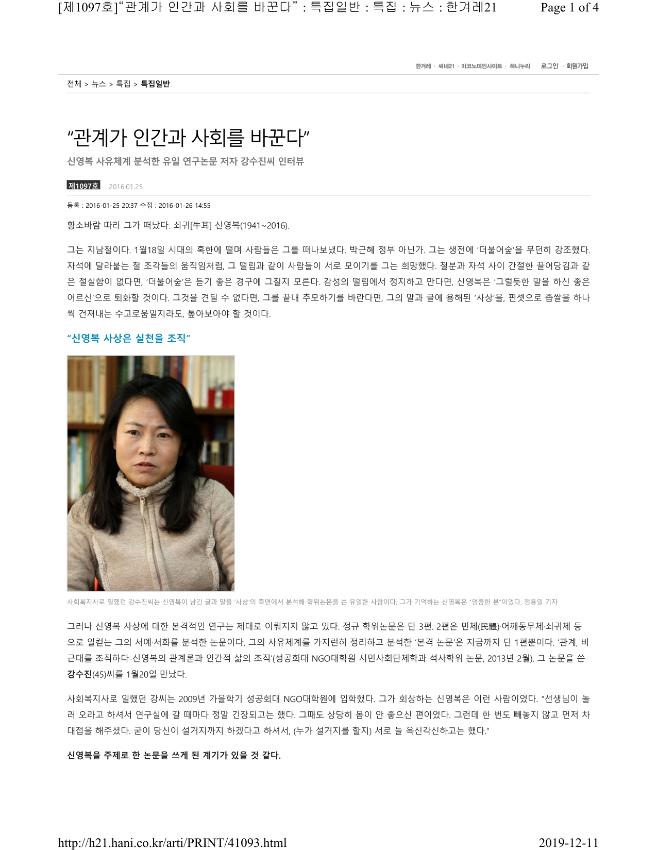 신영복 사유체계 분석한 유일 연구논문 저자 강수진씨 인터뷰 황소바람 따라 그가 떠났다. 쇠귀[牛耳] 신영복(1941~2016). 그는 지남철이다. 1월18일 시대의 혹한에 떨며 사람들은 그를 떠나보냈다. 박근혜 정부 아닌가. 그는 생전에 ‘더불어숲’을 무던히 강조했다. 자석에 달라붙는 철 조각들의 움직임처럼, 그 떨림과 같이 사람들이 서로 모이기를 그는 희망했다. 철분과 자석 사이 간절한 끌어당김과 같은 절실함이 없다면, ‘더불어숲’은 듣기 좋은 경구에 그칠지 모른다. 감성의 떨림에서 정지하고 만다면, 신영복은 ‘그럴듯한 말을 하신 좋은 어르신’으로 퇴화할 것이다. 그것을 견딜 수 없다면, 그를 끝내 추모하기를 바란다면, 그의 말과 글에 용해된 ‘사상’을, 핀셋으로 좁쌀을 하나씩 건져내는 수고로움일지라도, 톺아보아야 할 것이다. “신영복 사상은 실천을 조직” 그러나 신영복 사상에 대한 본격적인 연구는 제대로 이뤄지지 않고 있다. 정규 학위논문은 단 3편. 2편은 민체(民體)·어깨동무체·쇠귀체 등으로 일컫는 그의 서예·서화를 분석한 논문이다. 그의 사유체계를 가지런히 정리하고 분석한 ‘본격 논문’은 지금까지 단 1편뿐이다. ‘관계, 비근대를 조직하다-신영복의 관계론과 인간적 삶의 조직’(성공회대 NGO대학원 시민사회단체학과 석사학위 논문, 2013년 2월). 그 논문을 쓴 강수진(45)씨를 1월20일 만났다. 사회복지사로 일했던 강씨는 2009년 가을학기 성공회대 NGO대학원에 입학했다. 그가 회상하는 신영복은 이런 사람이었다. “선생님이 놀러 오라고 하셔서 연구실에 갈 때마다 정말 긴장되고는 했다. 그때도 상당히 몸이 안 좋으신 편이었다. 그런데 한 번도 빼놓지 않고 먼저 차 대접을 해주셨다. 굳이 당신이 설거지까지 하겠다고 하셔서, (누가 설거지를 할지) 서로 늘 옥신각신하고는 했다.” 신영복을 주제로 한 논문을 쓰게 된 계기가 있을 것 같다. 대학원에 들어갈 때 몇 가지 질문을 가지고 들어갔다. 딱히 답을 얻지 못하고 있었는데, 때마침 선생님이 계시더라. 그럼 선생님을 더 알아보자는 생각으로 하게 됐다. 개인적 인연이 있었나. 처음 성공회대에 들어갔을 때는 선생님이 학교에 계신지도 몰랐다. 책은 (읽어서) 알고 있었지만 그분이 어디 계시는지는 몰랐다. 나중에야 성공회대에 계시다는 걸 알았다. 선생님 수업(‘교육사회학 특강’)을 처음에 들을 때는 큰 생각이 없었다. 나중에 논문을 쓸 생각에 한 번 더 수강하겠다며 내가 수업 도우미를 하면서 계속 뵈었다. 논문을 쓴다는 말을 했나. 처음에는 말 못했다. 선생님한테 누가 되는 건 아닐까 걱정도 됐다. 한편으로는 사람들이 말하더라. ‘살아 계신 분을 써?’ ‘그분이 학자는 아니잖아?’ 이런 반응이 많았다. 논문 초벌이 나왔을 때에야 선생님한테 말씀드렸다. 강씨의 논문은 신영복 필생의 담론인 ‘관계론’에서 인간적인 삶을 위한 방법론을 모색하려는 의도로 출발했다. 신영복 사상의 두 축을 마르크스와 동양사상에서 짚은 그는 불안정·불평등·지속불가능을 특징으로 하는 신자유주의 자본주의 사회에서 근대와 구별되는 비(非)근대라는 개념을 통해 신영복의 사상을 조명했다. 논문 결론부에서 강씨는 신영복 사상의 요체를 이렇게 분석했다. “그의 담론에서 관계는 근대적 모순을 해체하고 재구성하는 실천을 조직한다. 즉, 인간적 삶을 위한 실천적 과정을 조직한다. 인간을 사회적 관계의 총체로 보는 관계론적 시각은 관계가 인간과 사회를 변화하게 하는 출발지가 되는 것이다. 신영복의 관계론은 인간적인 삶을 조직해내는 진지를 구축한다.” 연구되지 않는 신영복 신영복의 수업은 어땠나. 수업 전반기에는 고전 중심, 후반기에는 사회적 시각으로 여러 경험을 했던 사람들 이야기를 주로 하셨다. 논문을 쓰면서 어려웠던 점은. 선생님의 관계론이 주재료이다보니 논문 형식에 대해서도 고민을 많이 할 수밖에 없었다. 선생님의 관계론 자체가 분석이나 해석 같은 서구적인 인식의 틀을 지양하기 때문이기도 하고, 관계론 자체가 어떤 차이보다는 어떤 관계인지에 주목하기 때문에 기존 그릇에 관계론을 담아내기에는 한계가 있었다. 신영복의 사상적 측면에 대한 연구는 거의 없는 형편인데. 앞으로 많이 되기를 간절히 바란다. 학계에서 대부분 외국 사상을 많이 받아들이는데 안타깝다. 선생님과 관련해서도 여러 시각으로 연구가 많이 됐으면 좋겠다. ‘신영복이 학자는 아니지 않은가’라는 말을 들으면서 논문을 쓰는 것에 망설이지는 않았나. 내가 일반 정규대학을 다녔다면 신영복을 주제로 논문을 쓸 생각을 했을까 싶다. 사회에서는 고통이나 분노, 절망 이렇게 표현하는 것들이 대학에서는 이론적·중성적으로 많이 쓰이더라. 좀 충격이었다. ‘외부자의 시선’이어서 논문을 쓸 수 있지 않았나 싶기도 하다. 외국 사상을 철학적으로 소화하고도 (표 나지 않게) 말하는 선생님의 이야기를 이론화하는 것도 한 방법이겠다 싶었다. 더 정확한 방법이기도 하고 와닿기도 하고 우리 얘기이기도 하고. 오기가 생기기도 했다. 신영복의 사상을 다룬 유일한 논문을 썼다. 뒤집어 말하면 아무도 학