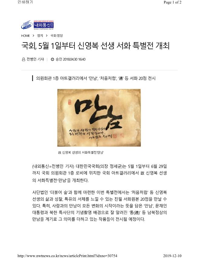 신영복 선생 서화 특별전 ‘만남’ 국회에서 만난다 5월 1일부터 의원회관 1층 아트갤러리에서 서화 20점 전시 2018-05-02 14:48 (수) 고(故) 신영복 선생의 서화특별전 ‘만남’ (내외통신=이유정 기자) 국회(의장 정세균)는 5월 1일부터 6월 29일까지 국회 의원회관 1층 로비에 위치한 국회 아트갤러리에서 고(故) 신영복 선생의 서화특별전 ‘만남’을 개최한다. 사단법인 ‘더불어 숲’과 함께 마련한 이번 특별전에서는 ‘처음처럼’ 등 신영복 선생의 삶과 성찰, 특유의 서체를 느낄 수 있는 친필 서화원본 20점을 만날 수 있다. 특히, 사람과의 만남이 모든 변화의 시작이라는 뜻을 담은 ‘만남’, 문재인 대통령과 북한 특사단의 기념촬영 배경으로 잘 알려진 ‘통(通)’ 등 남북정상의 만남을 계기로 그 의미를 더하고 있는 작품들이 전시될 예정이다. 고(故) 신영복 선생은 1968년 통일혁명당 사건으로 무기징역을 선고받아 20년간 복역하다 1988년 8월 15일 특별가석방으로 출소한 이래, 성공회대교수로 강의와 작품활동을 이어오다 2016년 1월 15일 별세했다. 저서로 ‘감옥으로부터의 사색’, ‘나무야나무야’ ‘더불어 숲’, 등이 있으며, 일명 ‘어깨동무체’로 불리우는 서민적 서체와 그림을 담은 다수의 서화를 남겼다. 내외통신