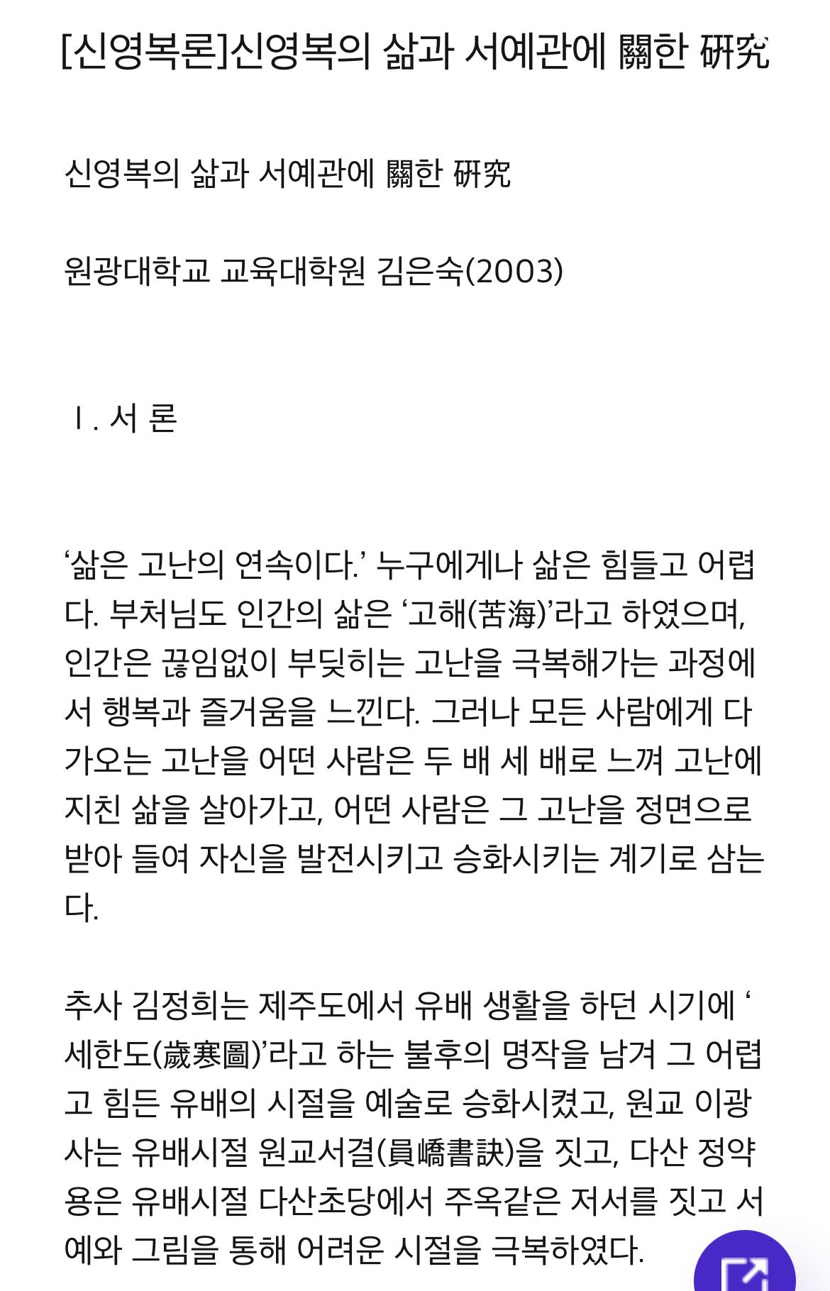 신영복의 삶과 서예관에 關한 硏究 원광대학교 교육대학원 김은숙(2003) Ⅰ. 서 론 ‘삶은 고난의 연속이다.’ 누구에게나 삶은 힘들고 어렵다. 부처님도 인간의 삶은 ‘고해(苦海)’라고 하였으며, 인간은 끊임없이 부딪히는 고난을 극복해가는 과정에서 행복과 즐거움을 느낀다. 그러나 모든 사람에게 다가오는 고난을 어떤 사람은 두 배 세 배로 느껴 고난에 지친 삶을 살아가고, 어떤 사람은 그 고난을 정면으로 받아 들여 자신을 발전시키고 승화시키는 계기로 삼는다. 추사 김정희는 제주도에서 유배 생활을 하던 시기에 ‘세한도(歲寒圖)’라고 하는 불후의 명작을 남겨 그 어렵고 힘든 유배의 시절을 예술로 승화시켰고, 원교 이광사는 유배시절 원교서결(員嶠書訣)을 짓고, 다산 정약용은 유배시절 다산초당에서 주옥같은 저서를 짓고 서예와 그림을 통해 어려운 시절을 극복하였다. 쇠귀1) 신영복 또한 학생에서 교수로, 교수에서 사형수로, 사형수에서 무기수로, 무기수에서 가석방으로, 가석방에서 사면 복권으로 반전을 거듭하는 삶을 거쳐 지금은 성공회대학의 교수로 재직하고 있다. 그러한 그의 삶은 우리 현대사를 그대로 반영하고 있는 일면이며 또한 우리 현대사의 “질곡의 역사”의 한 단면이라 할 수 있다. 우리는 신영복의 삶 속에서 6・25와 4・19 ・ 5・16과 유신 독재 시절을 거치며 살아 나가는, 결코 역사에서 분리될 수 없는 현실과 시대를 반영하는 인간 삶의 모습을 볼 수 있다. 신영복의 삶을 연구하기로 한 것은 두 가지 이유에서이다. 하나는 20년 20일을 감옥에서 보내면서 중심(中心)을 흩트리지 않고, 동양 고전 공부와 서예를 통해 ‘차가운 이성(cool head)’을 ‘따뜻한 마음(warm heart)’으로 변화시켜 승화시킨 점이 존경스러워서이다. 그는 감옥에서 결코 남을 원망하거나 사회를 원망하고 비난하지 않았으며 그 속에서 자신을 도야하는 계기로 삼았다. 특히 1년 6개월의 삶을 사형수로, 그 이후에는 무기 징역을 언도받고도 어떻게 그렇게 영혼의 울림이 되는 글2)들을 쓸 수 있을까하는 생각이 연구 의욕을 불러 일으켰다. 논자는 학교에서 학생들을 가르치는 일을 업으로 하면서도 학생들을 원망하고 학교의 현실과 교육정책에 상당한 불만이 있어 왔다. 따라서 학교에 대한 사랑이 시들해짐은 물론 학생들에 대한 원망의 감정이 적지 않게 있던 상태에 처해 있었다. 그러던 가운데 그의 글을 읽으면서 많은 용기와 희망을 갖게 되어 학생들에 대한 애정을 다시 갖게 되었으며 학교생활을 희망차게 할 수 있었다. 다른 하나는 서예에 대한 그의 생각과 글씨에 매력을 느껴서이다. 보는 사람으로 하여금 친근함을 느끼고 작품의 내용에 있어서도 많은 사람들의 사랑을 받는 그의 한글 서체인 ‘연대체’ ・ ‘어깨동무체’ ・ ‘협동체’라 불리는 새로운 한글 서체가 마음을 사로잡았기 때문이다. 본 논문에서는 Ⅱ장 신영복의 생애를 통해 그의 어린 시절의 삶과 감옥에서의 변화되는 삶, 그리고 퇴소 후의 활동에 대해서 살펴보겠다. 제Ⅲ장 학서 과정과 서예관에서는 정향 조병호와 만당 성주표로부터 서예를 배우는 과정과 신영복체3)라 불리는 서체의 형성과정, 『감옥으로부터의 사색』과 출소 이후 강연과 기고문 등에 나타난 서예정신에 대해 살펴보겠다. 제Ⅳ장 신영복 서예작품의 내용분석에서는 현실생활에 기초한 그의 서예 내용, 관계론을 강조하여 더불어 삶을 이야기하는 신영복의 다양한 서예작품의 내용에 대해서 살펴보고, 아울러 오늘날 자기 철학의 부재로 남의 글이나 글씨의 모방만을 일삼는 서예인들에게 신영복 서예가 주는 교훈은 무엇인가에 대해서 생각해보기로 하겠다. Ⅱ. 신영복의 생애 인간은 사회적 동물로 사회를 떠나서는 존재할 수 없다. 따라서 사회의 상황에 따라 인간의 존재하는 모습은 달라질 수밖에 없다. 그러한 면에서 지구상에 마지막으로 남아 있는 분단 국가에서 우리의 삶은 제한될 수밖에 없으며, 특히 신영복의 삶에는 그러한 우리 사회의 많은 현실과 역사가 담겨 있다. 감옥에서의 20년은 그에게 많은 변화를 준 시기이다. 차가운 이성을 따뜻한 가슴으로 변화시켜 관계론을 형성하고 서예학습을 통해 인간관계에서의 관계론을 서예에 접목시킨 시기이다. 본 장에서는 그의 생애를 크게 3시기로 구분하여 1절은 어린시절과 청년기로 일정하게 보호된 환경 속에서의 생활, 2절은 감옥에서의 삶으로 인간관계를 변화시켜 ‘관계론’을 형성하는 과정과 스승을 모시고 서예를 배우는 과정, 3절은 퇴소후의 활동시기로 구분하여 살펴보고자 한다. 가. 어린 시절과 청년기 아버지는 자작농의 맏이로 일제 때 대구 사범학교를 졸업한 교사였고, 어머니는 지주의 막내 외동딸로 아들 신영복은 1940년 10월에 잉태되어 1941년 8월에 태어났다. 고향은 경남 밀양이지만 아버지의 임지인 경남 의령군 유고국민학교의 교장 사택에서 초등학교 시절을 보낸다. 그 당시 관사에서의 생활은 학생들에게 부러움의 대상으로 오히려 친구들에게 멀어지는 듯한 생각이 들어 일부러 장난을 하여 벌을 자초하고 꾸중을 듣는 생활을 한다. 그는 스스로가 ‘교장선생님의