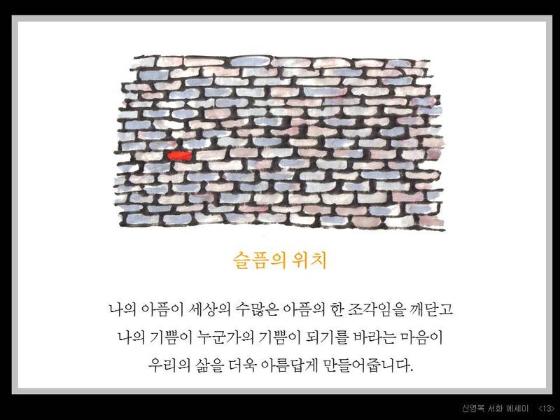 나의 아픔이 세상의 수많은 아픔의 한 조각임을 깨닫고 나의 기쁨이 누군가의 기쁨이 되기를 바라는 마음이 우리의 삶을 더욱 아름답게 만들어줍니다. 돌베개