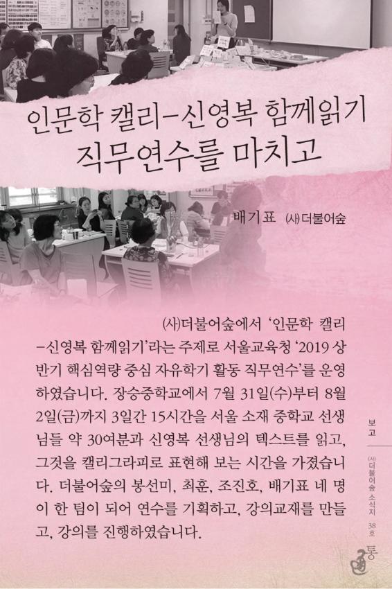 ()더불어숲에서 인문학 캘리-신영복 함께읽기라는 주제로 서울교육청 ‘2019 상반기 핵심역량 중심 자유학기 활동 직무연수를 운영하였습니다. 장승중학교에서 731()부터 82()까지 3일간 15시간을 서울 소재 중학교 선생님들 약 30여분과 신영복 선생님의 텍스트를 읽고, 그것을 캘리그라피로 표현해 보는 시간을 가졌습니다. 더불어숲의 봉선미, 최훈, 조진호, 배기표 네 명이 한 팀이 되어 연수를 기획하고, 강의교재를 만들고, 강의를 진행하였습니다.