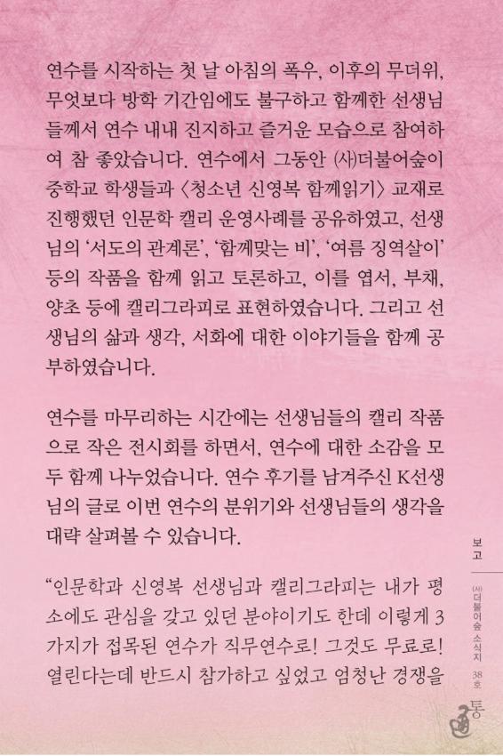 15시간의 연수에 담기에는 너무나 부족한 알찬 강의라서 30시간짜리 심화연수가 있다면 반드시 신청할 것같다! 나머지 15시간에는 글씨를 써내려가는 방법을 더 배우면 좋겠다는 생각을 했다. (중략-강사 칭찬 부분^^) 더운 여름에 시원한 강의실에서 새로운 사람들과 만나 서로에 대해 알아가며 선생님의 뜻이 담긴 좋은 글을 읽으며 써보는 경험을 한 것만으로도 보람있고 알찬 연수였던 것 같다.