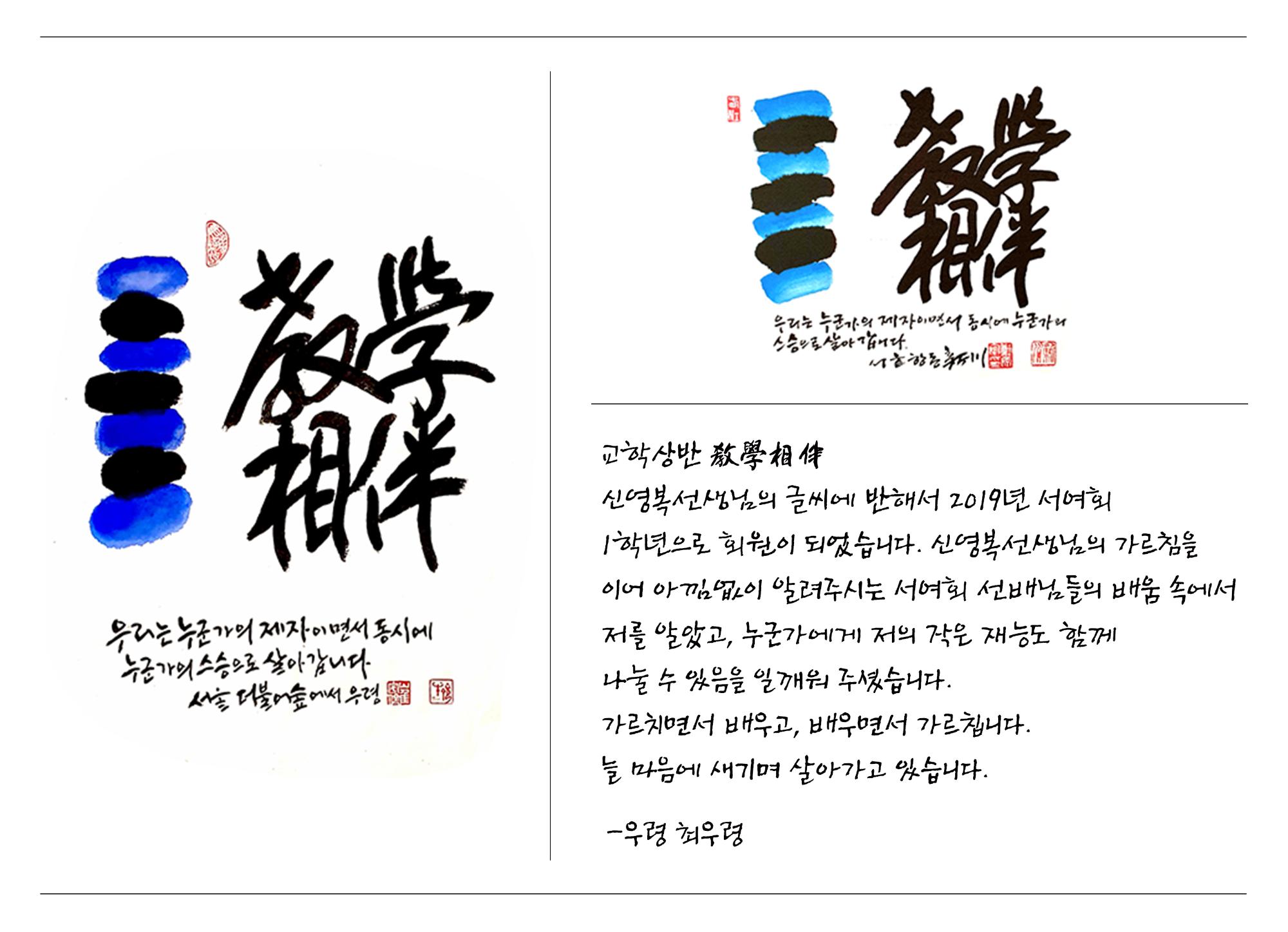 신영복선생님의 글씨에 반해서 2019년 서여회 1학년으로 회원이 되었습니다.