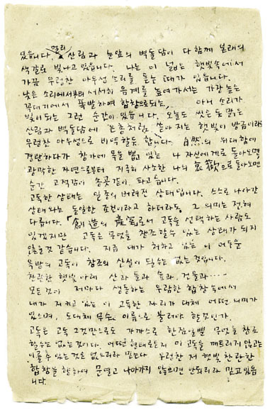 고성(古城) 밑에서 띄우는 글 오늘은 비가 내리고 있습니다. 비는 이 유형지의 어두운 분위기를 더욱더 축축한 것으로 만듭니다. 저마다 권태로움에 젖어드는 자신의 마음을 구하려 하지만 이미 수렁에 던져진 바위처럼 마냥 밑으로 밑으로 침하하기만 합니다. 세상의 가장 낮은 바닥에 쭈그리고 앉아 있는 처지에 다시 더 밑으로 떨어진다는 것은 결국 가상이고 '아이러니'가 아닐 수 없습니다. 그러나 이 허무한 가상 속에서 상당한 분량의 위로를 얻고 있는 것도 사실입니다. 가상에 의탁한 위안이 허무한 것임은 말할 필요가 없습니다. 하나의 가상이 무너질 때, 허황한 착각에서 깨어날 때, 퍼뜩 제정신이 들 때, 우리는 다시 침통한 마음이 됩니다. 이를테면 자물쇠 채우는 금속성의 마찰음이 귓전을 칠 때, 또는 취침 나팔의 긴 여운이 울먹일 때, 또는 잠에서 막 깨어 그것이 꿈이었다는 것을 알았을 때……, 이런 때에는 어김없이 현실의 땅바닥에 떨어져버린 한 마리씩의 깃이 젖은 새처럼 풀죽은 꼴이 됩니다. 이렇게 하루에도 몇 번씩 하늘과 땅 사이를 배회하는 가상 속에서 오히려 옥살이라는 고통과 위로를 혼동하며, 고통이든 위로든 그것을 애매하게 만들어놓습니다. 그러나 오늘같이 비가 내리는 날이면 자꾸만 밑이 꺼지는 공허를 어쩔 수 없습니다. 진흙바닥에 발이 박혀서 신발마저 뽑아내지 못한 채 끝내 울음을 터뜨리고 말았던 국민학교 시절의 기억……. 이제 한 달 안으로 이 고성을 떠나게 될 것 같습니다. 작년 1월 22일 하얗게 눈에 덮인 이 산성으로 실려온 지 벌써 1년 5개월, 그동안 나는 많은 것들을 여기 이 땅 속에 묻어두었습니다. 어쩌면 이 편지가 남한산성에서 쓰는 마지막 편지가 될지도 모릅니다. 이 편지 역시 이 땅 속에 묻는 편지이기도 합니다. 이곳은 나 한 사람만의 사연이 묻혀 있는 곳이 아니라 민족의 수난과 치욕이 멍든 비극의 땅이기도 합니다. 이조 16대 임금 인조가 청나라 태종의 말 아래 무릎을 꿇고 항복한 곳도 바로 이곳입니다. 그것이 약 300년 전의 일이고 보면 아직도 이곳 어디엔가 묻혀 있을 혈흔을 파낼 수 있을지도 모를 일입니다. 창문에서 보이는 산의 가장 높은 봉우리에는 큰 소나무가 다섯 그루 서 있습니다. 나는 노대위와 함께 저 소나무 밑에 앉아서 이쪽을 굽어보며 술 한 잔 기울일 것을 약속해두었습니다. 지금 막 취침 나팔이 울리고 있습니다. 요즈음은 취침 나팔을 스피커를 통하여 녹음방송하기 때문에 이 소리마저도 나무토막처럼 감흥이 없습니다. 하나 잃었습니다. 좀 전까지만 하더라도 수감자 나팔수가 옥상에 올라가서 설레는 가슴으로 불었었는데 지금은 그도 출감해버리고 불 만한 사람이 없나 봅니다. 며칠 전 중앙에 들렀더니 거기 벽 구석에 그 나팔이 걸려 있었습니다. 나는 조심스럽게 잠시 쓰다듬어보았습니다. 오랫동안 쓰지 않아서인지 윤기도 없고 군데군데 얇은 녹이 앉아 있었습니다. 사형수의 신발처럼 쓸쓸한 행색이었습니다. 이제는 모두들 곤한 몸들을 누이고 잠들어버린 듯 주위는 무덤 속 정적입니다. 송형모, 하종연, 김태일랑 세 명도 내 옆에서 고이 잠들고 말았습니다. 오늘 저녁에는 꼭 이야기 하나 들려달라고 그리도 졸라대더니……. 비가 많이 내렸습니다. '와우아파트'가 무너지고, 축대가 깨져 판잣집이 내려앉고, 태풍 '올가'호가 휩쓸어 산이 무너지는 등 숱한 재산, 인명이 또 한 번 액운을 당하고 있는데도, 이곳에서 비닐우산 한 자루 없이도 태무심으로 걱정 하나 없이 앉아 있습니다. 감옥의 벽은 태풍에도 꿈적 않을 만큼 견고하고, 높고 작은 반달창은 해가 떴는지 별이 떴는지도 가르쳐주지 않습니다. 이런 상황 속에서 얻은 평정함이란 도대체 무엇인가. 이러한 평정함이 도대체 나를 무엇으로 만들어갈 것인가. 주룩주룩 그치지 않는 빗소리는 이런 나의 심경을 축축하고 무거운 곳으로 끌어내리고 마침내 질퍽한 진흙바닥에 나앉게 합니다. 어깨가 젖고 가슴이 젖는 듯한 무거운 상념에 젖어듭니다. 이처럼 빗소리에 새삼스레 무거운 마음이 되는 까닭은 아직도 내게 숱한 미련이 남아 있기 때문이라 생각됩니다. 과거를 회상하는 것은 미래를 창백하게 만드는 일입니다. 사실 요사이 나는 지난 일들을 자주 떠올리고, 또 그것들을 미화하는 짓을 자주 하는 편입니다. 과거가 가장 찬란하게 미화되는 곳이 아마 감옥일 것입니다. 감옥에는 과거가 각박한 사람이 드뭅니다. 감옥을 견디기 위한 자위인 경우가 대부분입니다만 이 자위는 참혹한 환경에 놓인 생명이 자신을 보호하기 위한 생명운동 그 자체라고 생각됩니다. 자위는 물론 엄한 자기성찰, 자기비판에 비하면 즉자적(卽自的)이고 감성적인 생명운동임에는 틀림없습니다만 그것이 갖는 의미와 필요에 대하여 너무 심하게 폄하할 생각이 없습니다. 불모의 영토마다 자리잡고 있는 과거라는 이름의 숲은 실상 한없이 목마른 것입니다. 그늘도, 샘물도, 기대앉을 따뜻한 바위도 없습니다. 머물 수 있는 곳이 못됩니다. 나는 벽 앞에 정좌하여 동공을 나의 내부로 열기로 하였습니다. 내부란 과거와 미래의 중간입니다. 과거를 미화하기도 하고, 현재를 자위