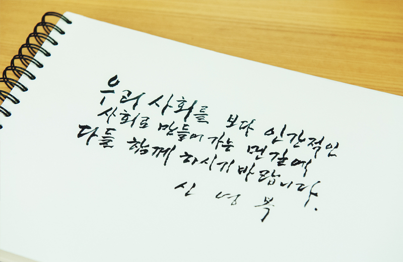 장시간의 인터뷰를 감당해 주신 선생께 스케치북을 슬며시 내밀었다. 몰염치하게도 <다들> 창간 축하 글씨를 부탁하기 위한 것이었다. 얼마나 자주 글씨 부탁을 받는지, 선생은 아예 속주머니에 붓펜을 가지고 다녔다. 붓펜을 꺼낸 뒤 잠시 생각에 잠기는 것 같더니 곧바로 써내려 갔다. 헤어지기 직전, 일행이 가지고 간 <감옥으로부터의 사색>과 <담론>, <강의>에 일일이 저자 사인을 해주는 선생께 슬쩍 물었다.