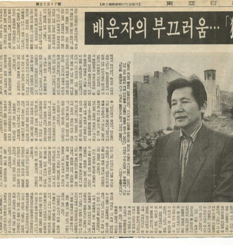 나의 서랍 속에는 교도소의 흙 한 조각이 간직되어 있다. 수많은 사람들의 좌절과 고통이 응어리진 그 흙에서 나는 수시로 우리 시대 우리 역사의 한 조각을 읽는다. 그리고 대학의 강의실에서 나는 높은 이상과 낮은 사랑의 젊음을 읽는다. 20년전의 과거이면서 동시에 미래이기도 한 젊음을 읽는다. 그리고 어제는 사진기자와 함께 찾아 간 서대문 구치소에서 벽돌 한 장을 들고 왔다. 허물어진 벽돌담 앞에서 사진을 찍으며 아직도 그 속에 남아 있는 수많은 사람들에게 송구스러웠다. 그리고 아직도 그 속에 남아 있는 나 자신을 발견하였다.